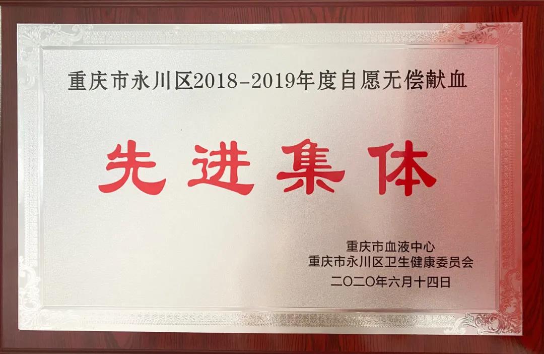 近日,重慶市血液中心、重慶市永川區衛健委表彰了2018-2019年度永川區無償獻血先進集體和個人。我院被評為2018-2019年度永川區無償獻血先進集體,區中醫院院長毛得宏、院辦主任石磊獲得2018-2019年度永川區無償獻血促進獎。同時我院醫護人員秦先兵、王春、段軍、鄧傑強、姚果、鐘永軍、廖利雲、何銀紅、袁栩欣分别榮獲2018-2019年度永川區無償獻血先進個人獎。
